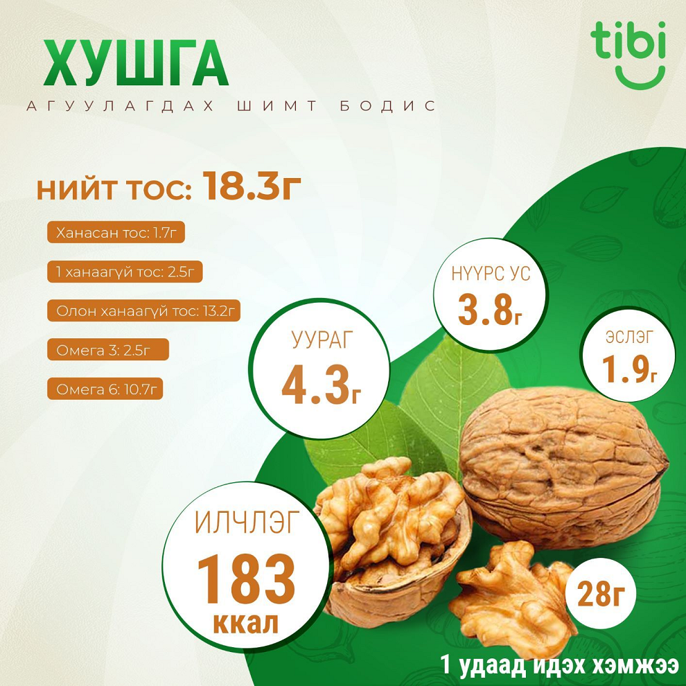 Уураг, өөх тосноос гадна төмөр, кальци, фосфор, кали, цайр, зэс зэрэг эрдэс бодис, А, Е, фолийн хүчил зэрэг аминдэм, омега-3 тосны хүчлээр баялаг.