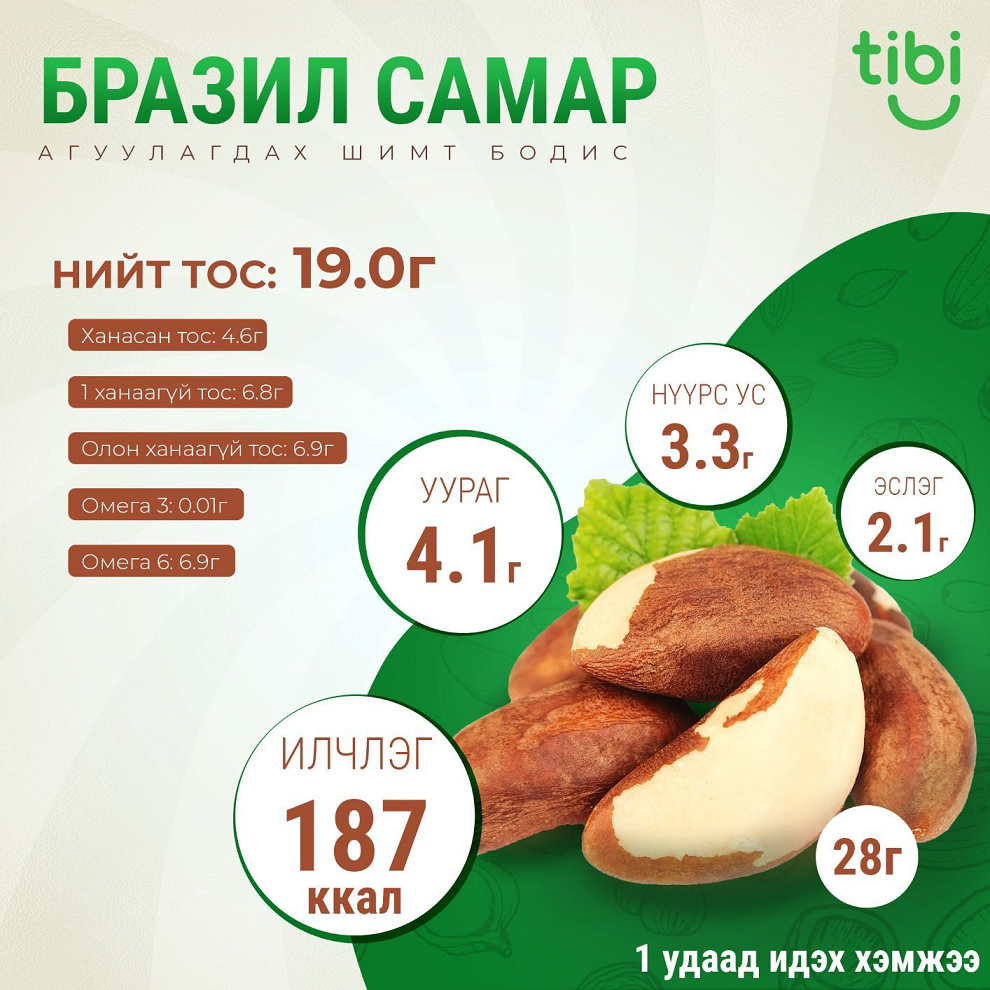 Самар дотроо хамгийн томдоо ордог. Бразил, Боливи, Перу дахь Амазоны ширэнгэн ойд ургадаг модны самар юм. Цөцгийн тостой дөхүү амттай. Ургамлын гаралтай уураг, сайн тосны хүчил, омега -6, селен, магни, зэс, фосфор, манган, тиамин, Е аминдэм зэрэг шимт бодисын агууламж үлэмж сайн. Мөн антиоксидант чанараараа алдартай бөгөөд селений хамгийн сайн эх үүсвэр юм.