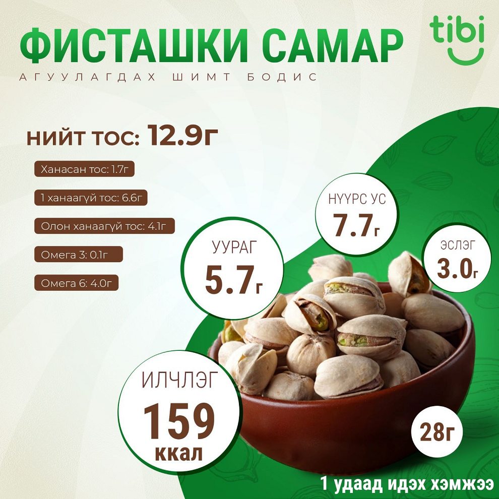 Фисташки нь хатуу хальс дотор байдаг. Ойрхи Дорнодоос гаралтай боловч өнөө үед гол үйлдвэрлэгчид нь Иран, АНУ юм. Зөөлөн, бага зэрэг чихэрлэг амттай бөгөөд бага зэрэг давстай хослуулан идэхэд илүү амттай байдаг. Зайрмаг, амттан зэрэг олон төрлийн хоолонд өргөн хэрэглэдэг.
