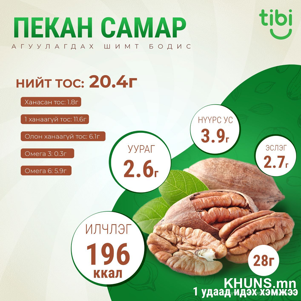 Мексик, Өмнөд Америкийн уугуул том навчит модны самрын нэг төрөл юм. Пекан самар нь ховил бүтэцтэй, идэхэд шаржигнасан, цөцгийн тосны амттай тул олон төрлийн хоол хүнсний гол орц найрлагыг бүрдүүлдэг. Эслэг, зэс, тиамин, цайр зэрэг хэд хэдэн чухал шимт бодисын сайн эх үүсвэр болдог. Бусад тосны адил сайн тосны хүчил, омега – 6, ургамлын уураг зэргийг агуулна. Эрүүл мэндийн ач холбогдол