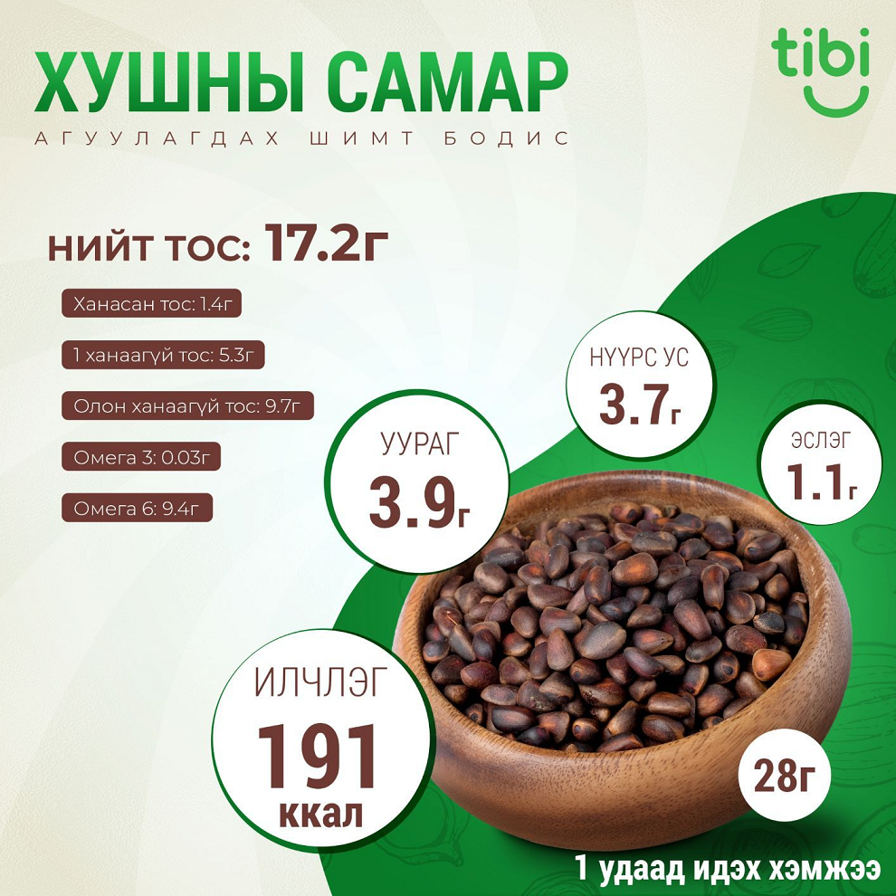 Манай улсад ургадаг цорын ганц самар. Хэнтий, Хангай, Хөвсгөлийн уулс даган ургах бөгөөд намрын сүүлийн саруудад бүрэн боловсорч гүйцдэг. Бусад самартай харьцуулахад аминдэм, эрдсийг 10 дахин их, А, В1, В2, В6, Д, В12, С витамин болон эслэг агуулдаг. Самрын уурагт триптофан, лизин, валин, гистидин, тирозин зэрэг үл орлогдох амин хүчил агуулагдах тул чанар сайтай уургийн тоонд багтдаг. Самрыг түүхийгээр эсвэл хуурч хоол хүнсэндээ хэрэглэхээс гадна төрөл бүрийн хүнсний бүтээгдэхүүнийг биологийн үнэт бодисоор баяжуулж хүнсний нэмэлт болгон ашигладаг. Тосыг нь шахаж нь эмчилгээ, гоо сайханд өргөн ашиглаж байна. Мөн самрын цөмийг импортод сүүлийн жилүүдэд маш ихээр гаргаж байна.